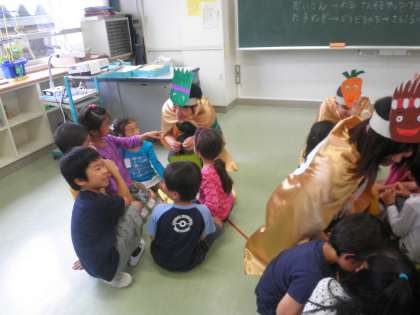 野菜を食べないと、体調が悪くなることがあること、いろいろな野菜に働きがあることなどを、紙芝居やベジレンジャーと一緒に学習しました。