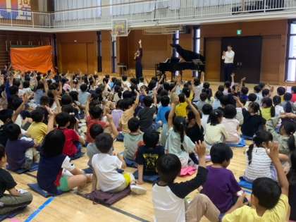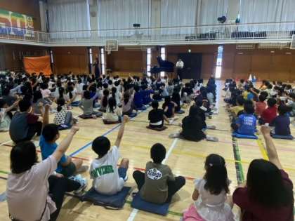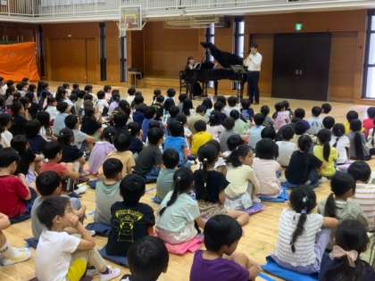 つくし学級、せせらぎ学級と1年生から3年生を対象にした、エバリーさんによるコンサートが体育館で行われました。楽器は、なんと尺八とピアノです。伝統的な曲目から、アニメソング、ラテンの曲まであります。子どもたちは、手拍子やかけ声でも参加しました。素敵なコンサートをありがとうございました。
