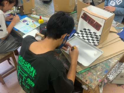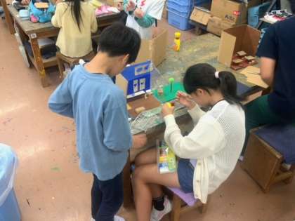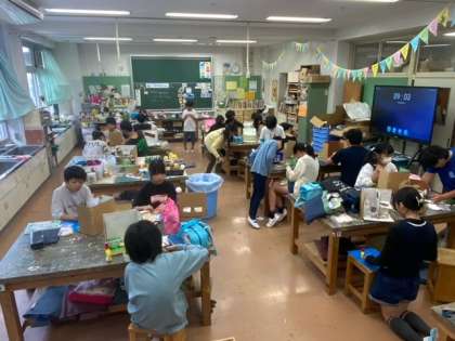 図工で「わたしのお店屋さん」で、材料を組み合わせて、つくりたい形や小物を工夫してつくっていきます。子どもたちは、夢中になって取り組んでいます。楽しみながらつくっていることが伝わってきます。
