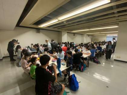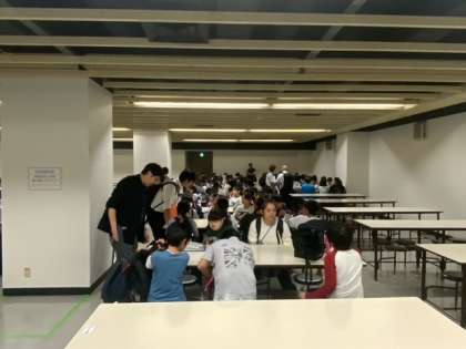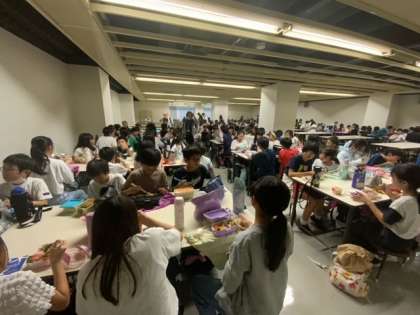 科学技術館内で昼食です。工場で食べ物を作っていたので、早くからお弁当を楽しみにしていました。