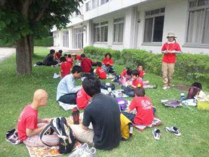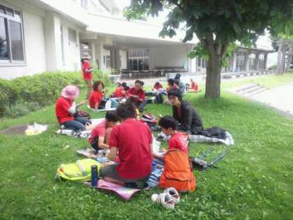 宿舎につきました。雨も降っていないので、宿舎の庭で昼ご飯を食べました。