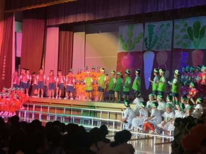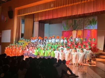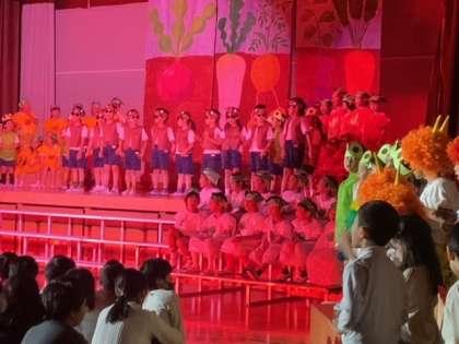1年生は、「はたけのしたは おおさわぎ」です。衣装を身に付けて、移動している時から、上級生から、かわいいと声をかけられたり、手を振ったりする姿が見られました。自分の台詞以外にも、みんなと合わせて言う台詞や歌がたくさんあります。自分たちだけでもどんどん劇が進められています。