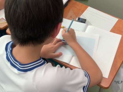 算数で平行の学習に取り組んでいます。三角定規を使って、マス目のない紙に平行の線を書きました。そして、三角定規を使わないで平行の線が引けるかも挑戦しました。次に、方眼紙を使って垂直な直線や平行な直線が引けるかも考えていきます。