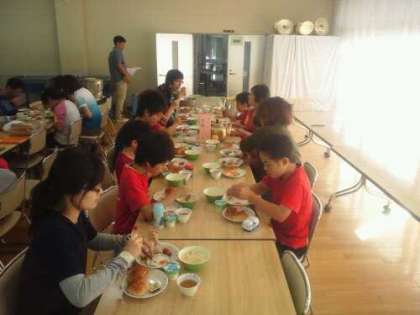 宿舎最後のご飯です。食事係の児童も3日間しっかりできました。これから、閉園式をして、恩師林庭園に向かいます。