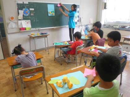 4年生以上が河口湖に出かけている、つくし学級では図工の学習をしていました。紙をくるくる巻いて、出来上がったのは、かわいいカタツムリでした。