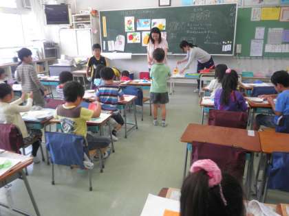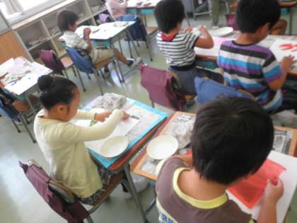 1年生が図工の授業をしていました。お花紙にのりをつけて丸めたり、平たく貼ったりして絵のようにしています。そろぞれの子どもが、お花紙をいろいろ工夫して楽しく取り組んでいます。