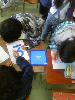 学級目標を一文字づつ班で丁寧に描いてます。