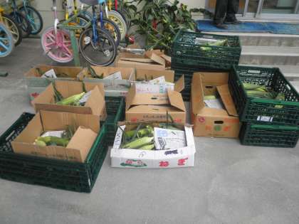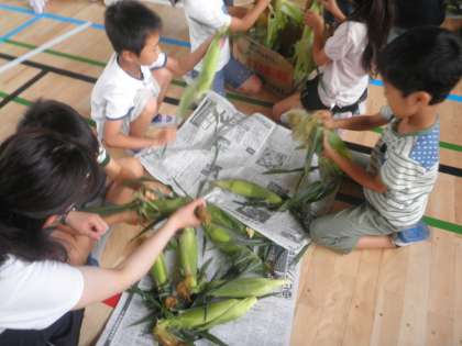 今日は2年生が、給食で使うトウモロコシの皮むきをしました。全校児童の分ですので、相当な量のトウモロコシの皮をむきます。