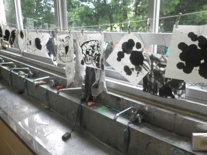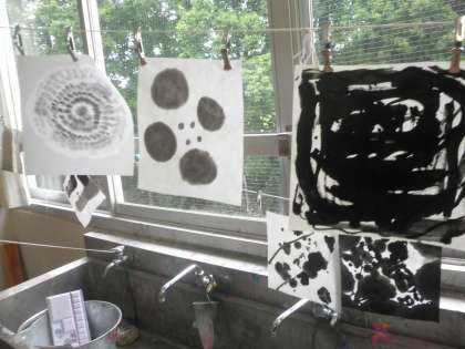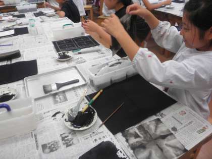 6年生の図工の授業を見ました。墨を使っていろいろな表し方を考えてやっていました。墨の特性を生かして面白い作品がたくさんでき上っていました。