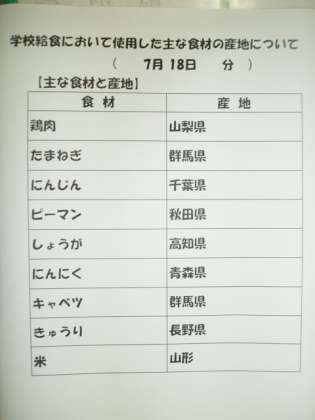 7/18 今日の給食の食材の産地