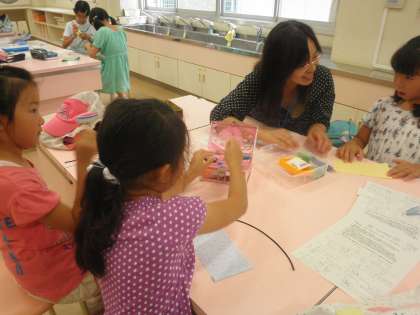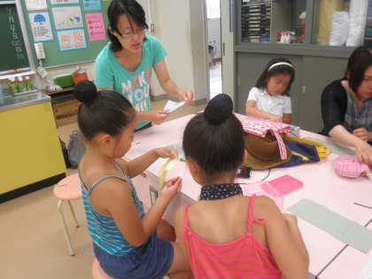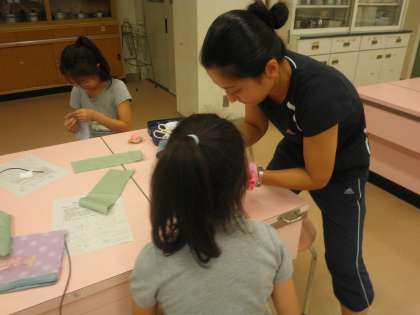 手芸では髪につけるシュシュを作っていました。みんな真剣に針を使って縫っています。