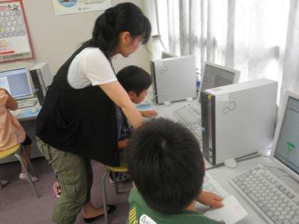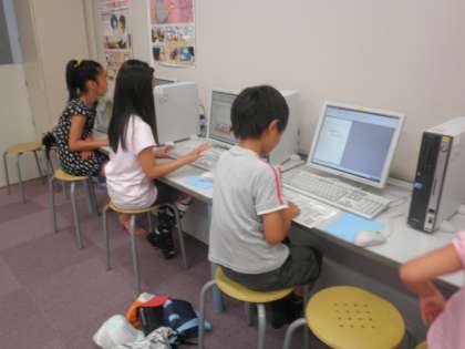 パソコン教室では、子どもたちが、カード作りやお絵かきをやっていました。1年生からゆっくりでもローマ字入力の練習をしています。かわいいカードができました。