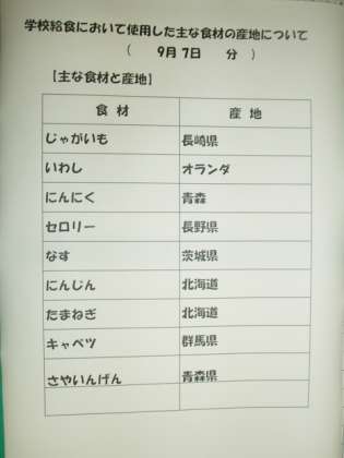 9/7 今日の給食の食材の産地について