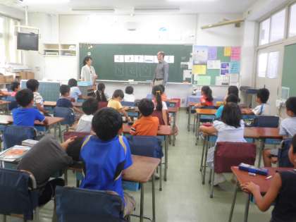 今日は3の1、2の3、4の1、2の2で英語の学習をしました。外国語の先生がと好きなスポーツや、ビンゴゲームなどをやっていました。みんな元気に答えていました。