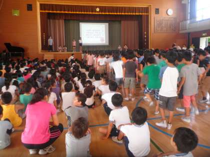 今朝の音楽集会は「もりのくまさん」でした。歌だけでなく、3つのリズムを足や手などを使って打ってみんなで合わせました。いろいろなリズムが合わさって楽しい歌になりました。