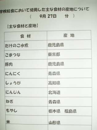 今日の給食の食材の産地は以下の通りです。