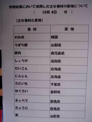 10/4 今日の給食の食材の産地