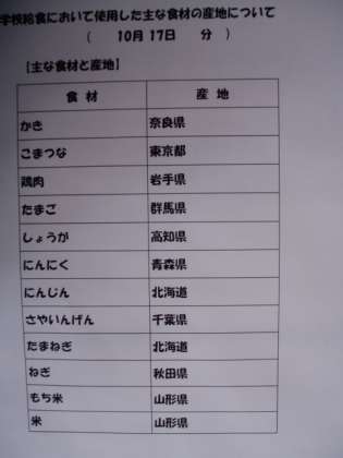 10/17 今日の給食の食材の産地