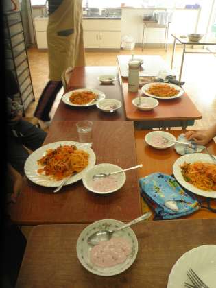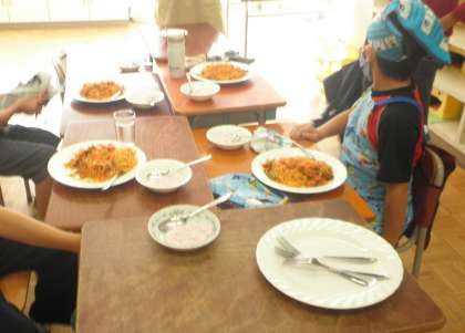 つくし学級の調理実習です。つくし学級は、総合的な学習で小麦」について学習しています。今日はスパゲッティを作りました。おいしそうです。