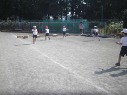 「跳」の運動で、砂場の前で段ボールを飛び越える学習をしていました。みんな先生の話をしっかり聞いて頑張っていました。