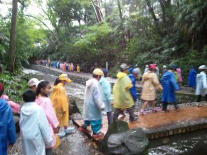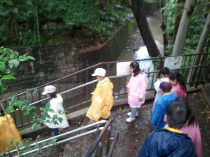 最後は等々力渓谷です。雨が降りそうなので、カッパを着てあるいました。昼間に降った雨のせいで水の量はすごいです。滑らないよう気をつけて歩きました。
