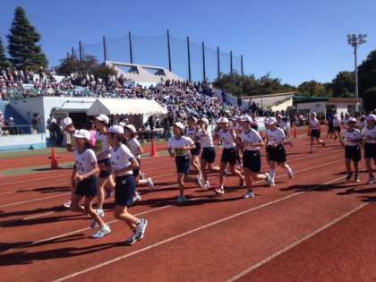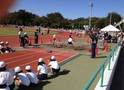 午前中は女子の種目です。まず、レッツランニングで女子全員が技場のグランドを走ります。その後各種目の競技です。写真は、幅跳びの様子です。