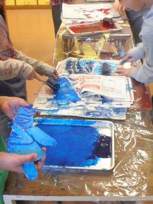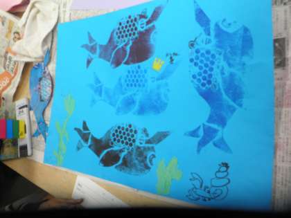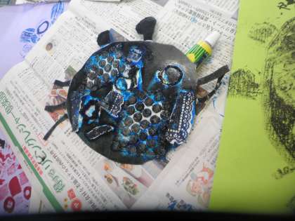 「紙版画」でいろいろな材質の違うものを貼りつけて版画を作っています。