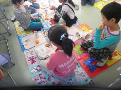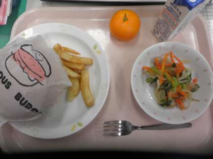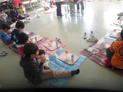 今日の給食は、手早くできるよう、チキンバーガーでした。特に、1,2年生は、ハンバーガーとポテトとウィンナーなどをパックにしてつめてもらい、お弁当のようになっていました。1,2年生はビニールシートを敷いて楽しそうに食べていました。
