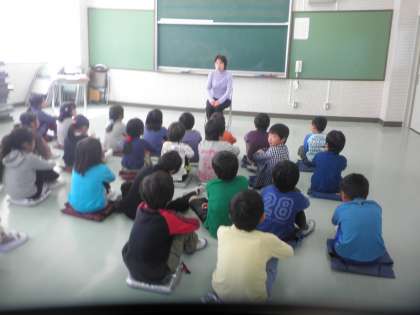 1年生のお話の会の様子です。今日のお話は、3匹の子ブタや王子様の耳はロバの耳などでした。特に3匹の子ブタは結末がいつもと違っていて、子どもたちはびっくりしたようです。みんな真剣に聞いています。