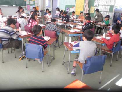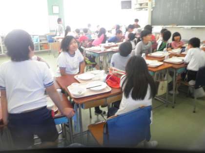 今日はたてわり給食でした。1年生から6年生までのたてわり班で給食を食べます。それぞれの班で座り方を工夫して仲良く食べています。