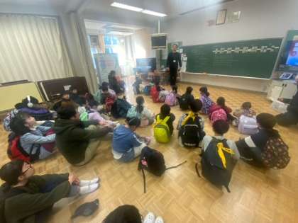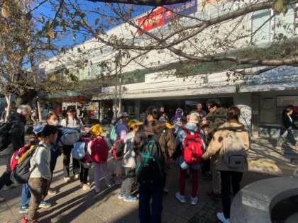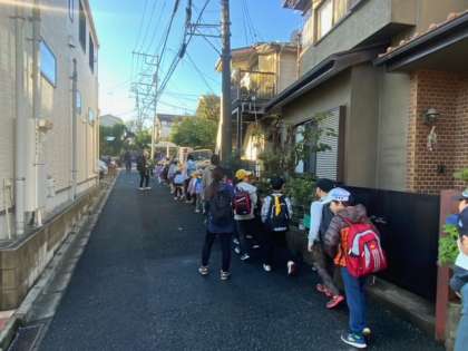今日は、とてもいい天気です。つくし学級は、「アクアパーク品川」へ遠足です。全員が出席できて嬉しいです。出発式を終えて、まずは、仙川駅を目指しました。電車に乗って行きます。