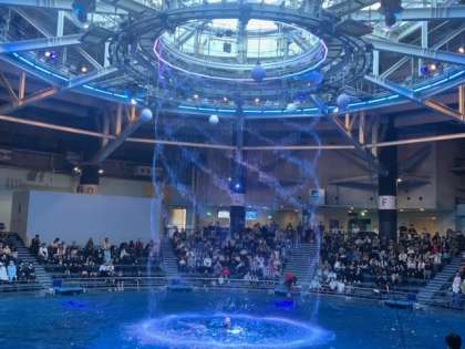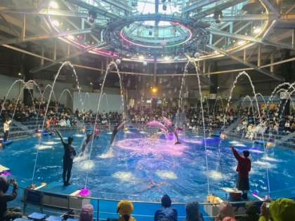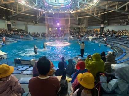 イルカショーをみんなでみました。前の方は水がかかるかもしれないので、カッパを着て準備はバッチリです。イルカのジャンプはもちろんのこと、光に音楽、噴水の演出もとてもきれいでした。の