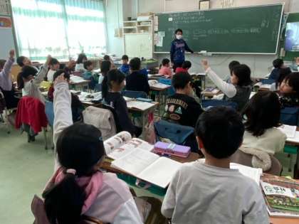 社会科で、スーパーマーケットで働く人々は、どんなことに気をつけているのかを、商品を並べている人、レジ担当、仕入れをしている人、切り分けている人、副店長などの立場を教科書から読み取り、体験と合わせて考えていきます。