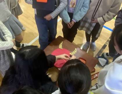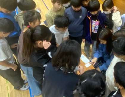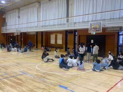 体育館で、総合的な学習の時間を使い、5年生が留学生に日本や世界の文化や遊びを調べて紹介し、交流をしました。