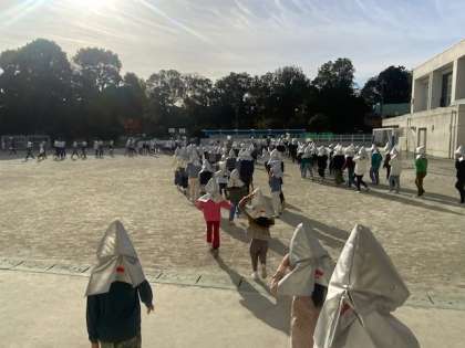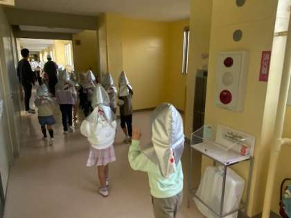 家庭科室からの出火を想定しての避難訓練です。子どもたちは真剣に取り組むことができました。空気が乾燥する季節で、火災のニュースも増えてきました。フリースなどの服装の時には燃え移りやすいので、火の取り扱いにはくれぐれも気をつけましょうと話しをしました。