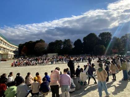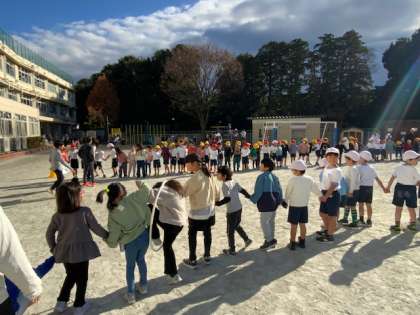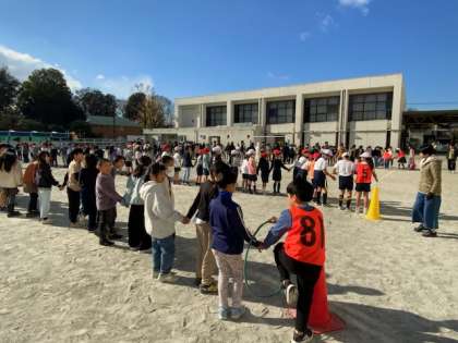中休みに、代表委員会の呼びかけで、全校の希望者で一緒に遊びました。今回は,フラフープリレーをして楽しみました。