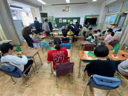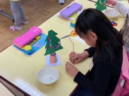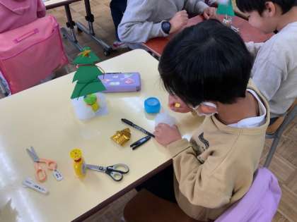 図工で、「ぼくのわたしのミニツリー」づくりをしています。ビーズや毛糸、モールなどで飾り付けていきます。夢中になって取り組んでいます。