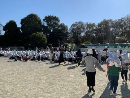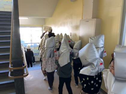 火災を想定しての避難訓練です。素早く行動して、校庭に避難することができました。火災の際には、煙を吸わないように行動することの大切さを話しました。