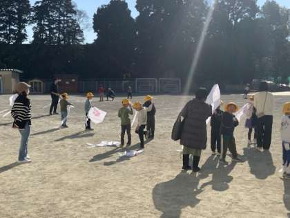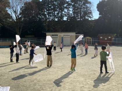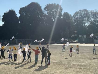 校庭で、凧揚げをしています。風がないのでお友達と協力してがんばって走ります。学校公開で保護者の皆さまのお手伝いもありがとうございます。