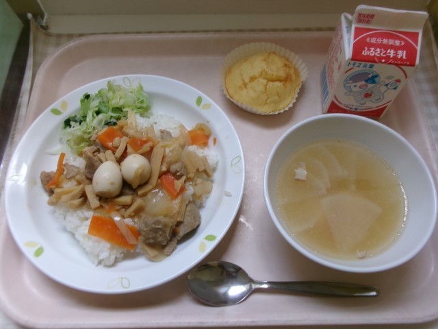 ☆今月の世界の料理は台湾料理です。「ルーローハン」は台湾料理の定番料理とも言われています。豚肉は醤油と砂糖で甘辛く味付けをして、シナモンを入れて香りづけをしました。栄養バランスを考えて、野菜や高野豆腐を入れて作りました。