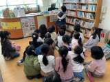 図書の時間での読み聞かせです。お話しの世界に入って夢中になっています。