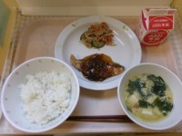 4月30日(水)今日の給食*麦ごはん*卵とわかめのスープ*鮭の変わりソースかけ*...