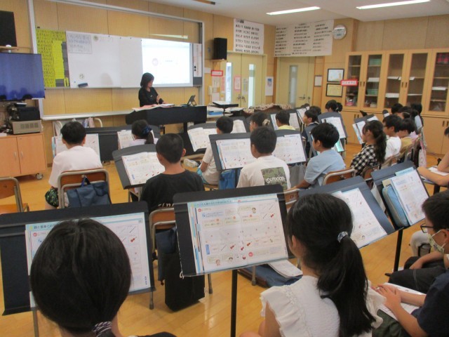 5年生音楽、2年生道徳の学習の様子です。5年生音楽では、「祝典序曲」を聴いて、3つの旋律を演奏する楽器に注目したり、気に入った部分を見つけたりしながら、曲や演奏のよさや楽しさを味わっていました。