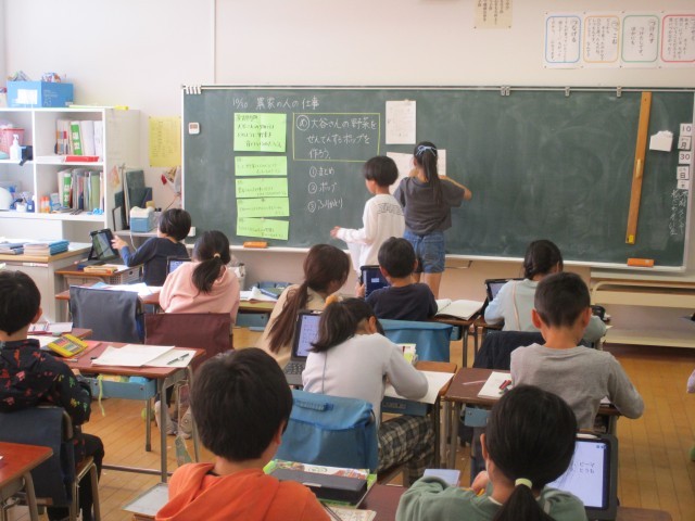 1年生国語、1年生音楽、3年生社会の学習の様子です。1年生国語では、説明的文章「うみのかくれんぼ」の学習に取り組んでいました。グループで協力して学習をすすめていました。