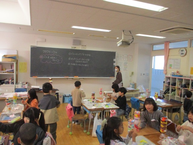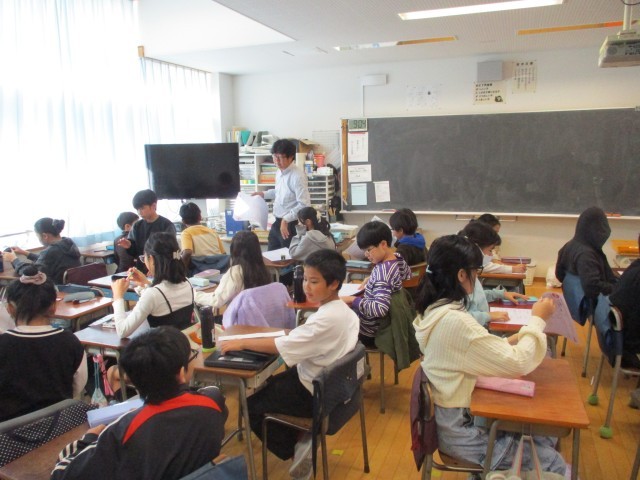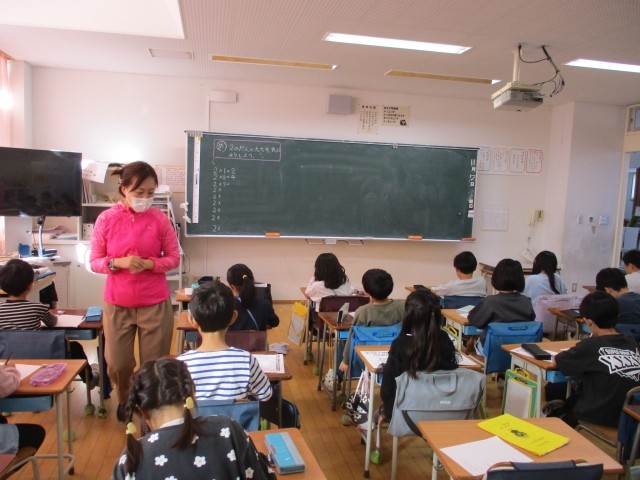 2年生算数、2年生図工、5年生算数の学習の様子です。2年生算数では、かけ算の学習で、2の段の九九の構成の仕方を理解することを目標にして学習に取り組んでいました。