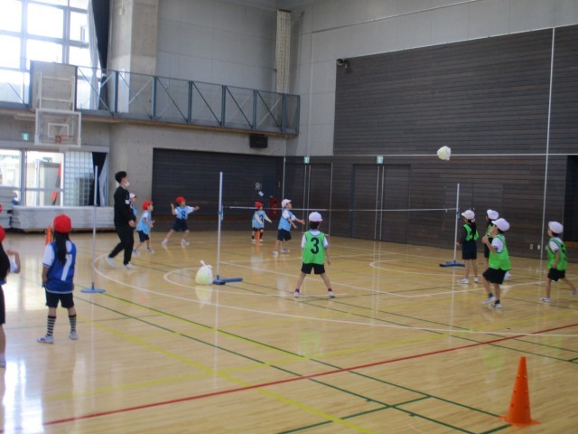 1年生生活、1年生体育の学習の様子です。1年生体育では、ネットをはさんでボールを投げ合う「ボール投げゲーム」に取り組んでいました。