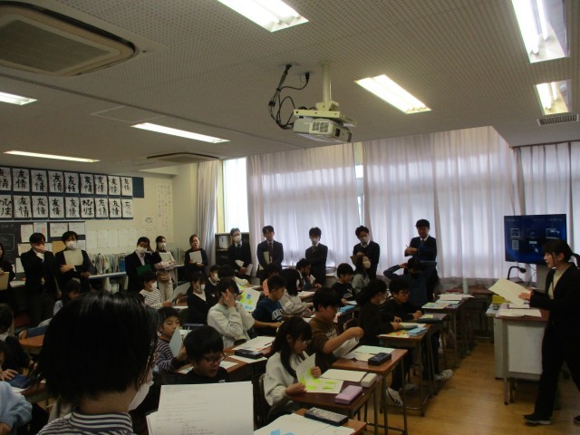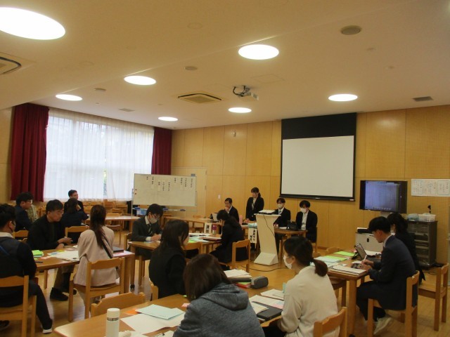 11月11日5時間目に6年2組で校内研究授業がありました。宮沢賢治の「やまなし」について、5月と12月の場面を対比して話合いながら理解を深めていく児童の姿が見られました。教員が授業参観をして、その後、手立ての有効性について検討を行いました。今回も大学教授を招聘して、教員の指導法についてご助言をいただきました。