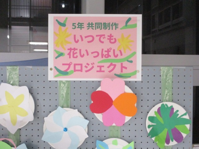 1階昇降口が受付です。5年生の共同制作「いつでも花いっぱいプロジェクト」がお待ちしています。