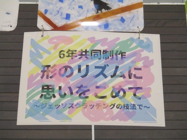 体育館後方の天井には、6年生の共同制作「形のリズムに思いをこめて」が展示してあります。