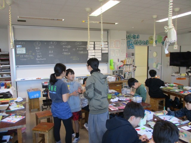 4年生体育、5年生図工、1年生体育の学習の様子です。5年生図工では、「様々な気持ちを色や表し方を工夫して表そう」をめあてにしてスタッパリングに取り組んでいました。